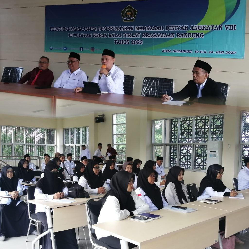 Sebanyak 30 Guru Madrasah Diniyah Takmiliyah (MDT) di Kota Sukabumi mengikuti Pelatihan Manajemen Pembelajaran Diniyah Angkatan VIII di Wilayah Kerja Balai Diklat Keagamaan Bandung Tahun 2023. Kegiatan dilaksanakan selama 6 hari di Aula PLHUT Kemenag Kota Sukabumi, mulai tanggal 19 s.d. 24 Juni 2023.