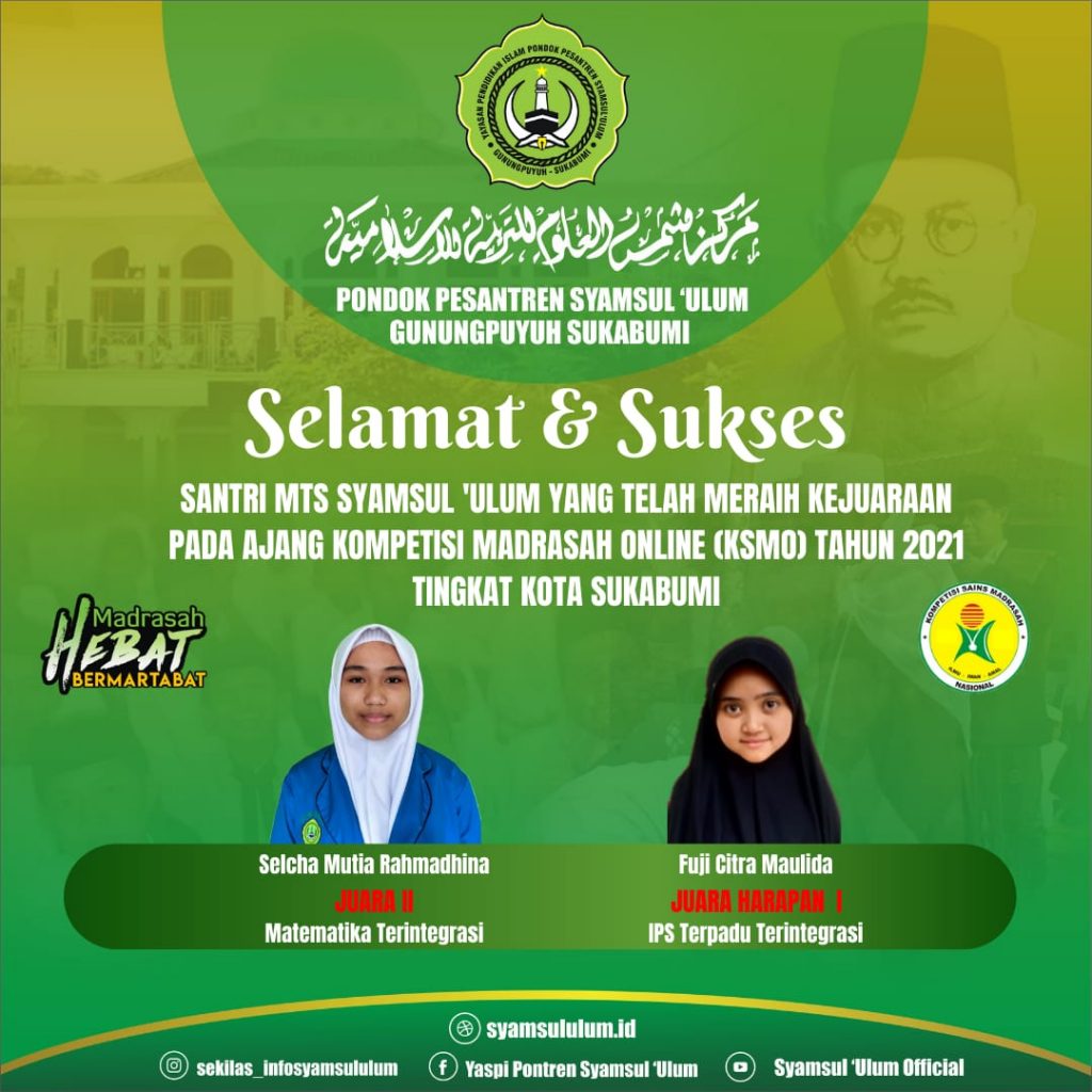 Untuk tahun ini MTs Syamsul “Ulum berhasil meraih beberapa juara diantaranya juara 2 Bidang matematika terintegrasi diwakilkan oleh Selcha Mutia Rahmadhina dari kelas IX.2 dan juara harapan 1 dibidang IPS Terintegrasi diwakilkan oleh Fuji Citra Maulida kelas VIII.2.