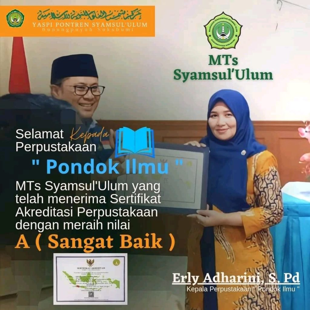 Pemberian Sertifikat Akreditasi Perpustakaan dihadiri oleh Wali Kota Sukabumi, dan diserahkan secara langsung oleh Wali Kota Sukabumi kepada Erly Adharini, S.Pd. selaku Kepala Perpustakaan MTs Syamsul’Ulum kota sukabumi.